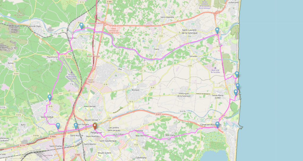 Sortie de 52km en boucle : Perpignan – St Estève – Peyrestortes – Rivesaltes – Torreilles – Ste Marie – Canet – Perpignan.