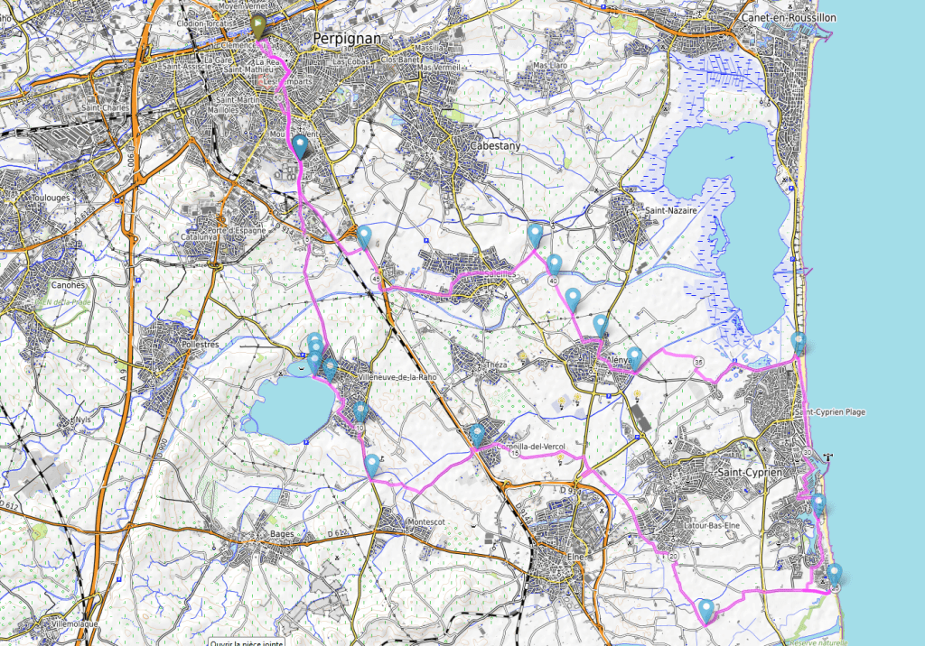 Itinéraire essentiellement plat, par pistes cyclables, chemin et routes peu fréquentées.