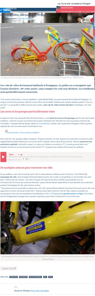2016-11-23 : France Bleu Roussillon Article Les vols de vélos, une épidémie à Perpignan